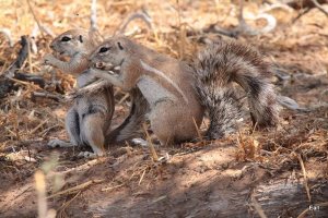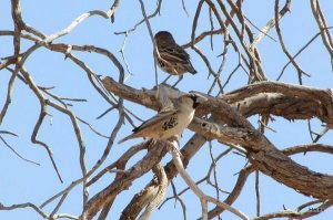 Other interesting sightings during the day were crimson-breasted shrike, a family of ground squirrels and one emerging from his hole, familiar chat, chat fly catchers, marico fly catchers, an Ovambo Sparrow-hawk, an ostrich family with about 5 chicks, a steenbuck, two springbok having a head to head confrontation among the usual jackals, secretary birds, kori bustards and red hartebeest.