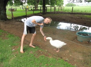 After breakfast and packing as quickly as we could – the trailer had to be hitched too – we had everyone in their chosen seat – I can assure you there were one or two hiccups over this – we hit the road. It was a glorious day and birds were active in the farmlands and the kids called out – long tailed widowbird – remember we used to call them sock birds – red-shouldred widowbird, steppe buzzard, black shouldered kite, guinea-fowl, Egyptian goose, red bishop, stonechat etc as we whizzed past not having time to stop and stare. We discussed the greenness of Kwa-Zulu compared to the Western Cape and Karoo and marvelled at the amazing lakes and majestic Drakensburg as we got closer and closer. Finally we reached the litter town of Underberg and stopped at the tackle shop to top on flies and other essential fishing tackle of which there is never enough. We purchases three pairs of cheap binoculars so that each child would have a pair and completion for who gets the other extra pair is reduced. I got a new pair of sturdy walking shoes and Earl replaced socks and underpants of which he has a dwindling supplyJ We then retraced our steps a few kms to the turnoff to Drakensburg Gardens so that we could go to The Duck and Dolittle for lunch. Bench seats and tables with gay umbrellas are available outdoors and there is petting farm which is a huge draw-card to the young ones. Even Jay and Joshua at the ripe old ages of 12 and 13 enjoyed the goats, piglets, donkeys and rabbits. I gave each child R2 and they dashed off to buy seeds and pellets to feed the animals.