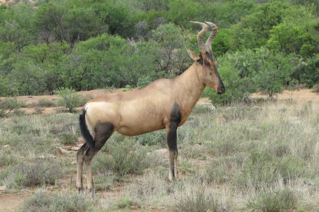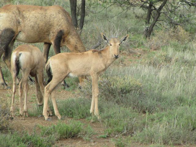 The park was green but looked like it had not received rain that day. The man at the gate told us their last rain had been on Thursday. The first creatures to greet us were white-tailed Gnus (black wildebeest). Red Hartebeest were shy and ran off as soon as we tried to take their portraits. We were pleasantly surprised at how plentiful the game was – springbuck, eland, kudu, zebra, gemsbok etc were all grazing and browsing contentedly.