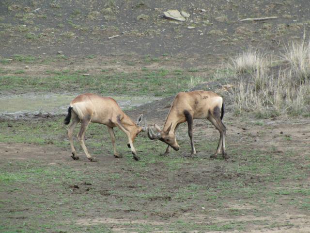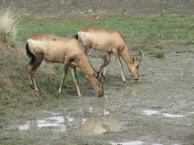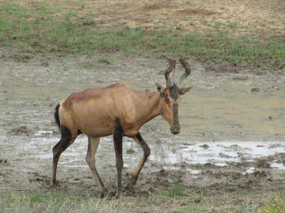 We enjoyed watching a group of red hartebeest interacting at a muddy puddle, rolling in the muck, drinking and sparring with each other.