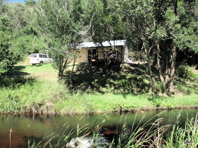 Finding the cottage halfway between Mossel Bay and Oudschoorn was an adventure along steep and windy gravel roads but we with Priscilla’s excellent navigation we had not trouble finding our way.   We were met by Jolene and Marius and taken to the lovely little cottage which just took our breath away.  The two of them built it from local stone and made the doors and cupboards from yellow-wood trees that washed down the river in a storm.  It was perfect – had everything we needed and being right on the river bank under big shady it was ideal for watching birds.  We hardly needed to move from the deck.    Right in the tree in front of the cottage Jolene pointed out an Amethyst Sunbird nest.  Later we saw Mrs. A busily lining the nest and Mr. A was at hand to see that all was going to plan.
