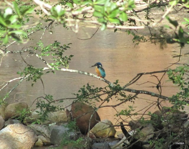 On our last morning we did not want to miss a second of the bird life and so Heather, Priscilla and I were up at dawn only to find that it was chilly and overcast and hardly a bird tweeted!   However, when the day warmed up and we were finishing off our breakfast I stepped out onto the deck to see if anything was about.   I spotted the bird we were dying to find and called for the others to come – no response – I ran indoors – “When I say come – I mean now!” I called urgently.  Heather’s hands were wet – Pris was busy with something but they rushed out and we got beautiful views of the half-collared kingfisher – a special for the area.  When I saw him he was close by on a flat rock in the shallows of the river but then flew up onto a low branch of a tree.  Within seconds Heather had the bird in the scope and everybody got good views of him.  I tried to get closer with the camera but he soon flew down-stream.  But he was certainly the highlight of our weekend.