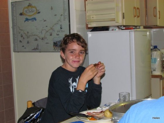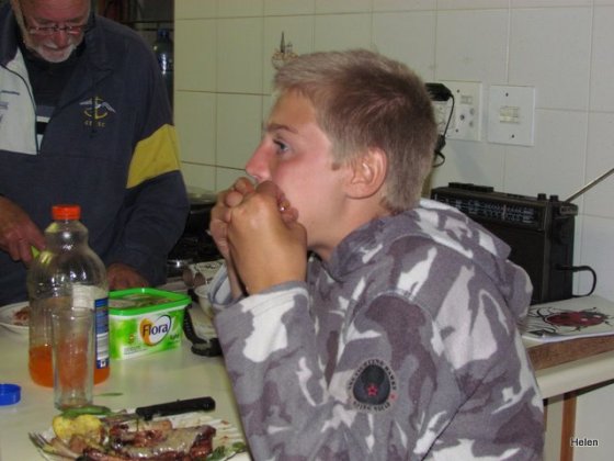 There were squeals of delight when Earl lit a braai and announced that there would be no fish for supper tonight! Instead they tucked into spare ribs, steak, sweet potatoes and salad followed by chocolate ice cream.