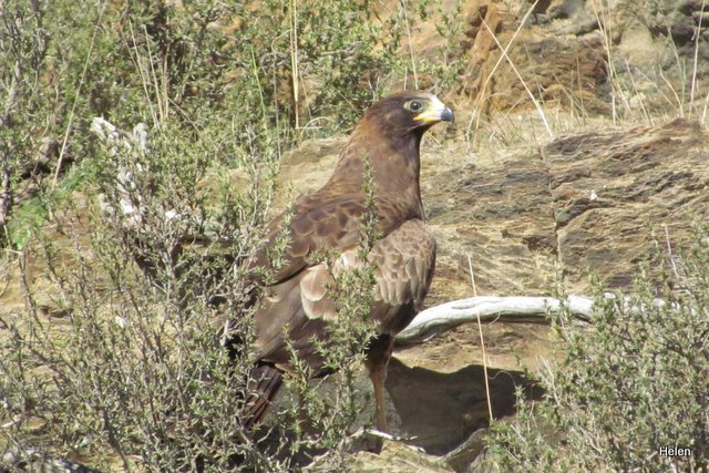 We insisted that the six lively boys quieten down and keep their eyes open for birds and beasts on the journey there. They were all equipped with binoculars and some had cameras. There were the usual crows, hadedas, fiscals and starlings. They found the blue cranes and were thrilled to see a Denhams’s bustard although it was quite far from the road. The little capped wheatear posed beautifully and when we stopped to look at pack of yellow mongoose and a tiny lark, Josh called – look an eagle. And right there next to us climbing on the rocks was a lovely steppe buzzard. Perhaps he was finding lizards or mice but I’d never seen one hunt in this way before.