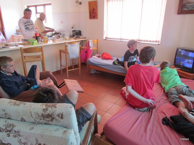The day started looking like the sun would shine and then it rained! We left the boys to lie snugly in bed till 9:00 a.m. then fed them Coco Pops, made two of them take a bath, told the rest to wash up the breakfast dishes and then left them to fend for themselves for an hour. Grandpa and I found a little place called Bistro on Main and indulged in a scrambled egg and salmon breakfast in front of a cosy fire! We then did a bit of shopping and returned to the gang some of whom had gone off on their bikes while the rest lounged around. Jaryd was packed and ready to leave – his parents were on their way to collect him as he has a couple of projects to work on before he returns to school and becomes involved in a heavy week of entertaining a touring team from Grey College.