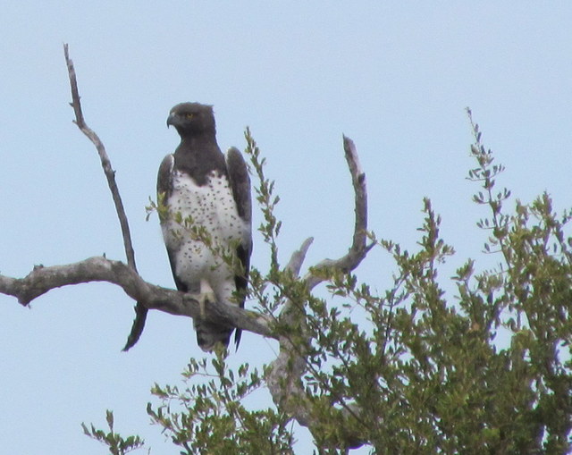 The brown snake eagle has yellow eyes and feathers only to its knees while the lesser spotted eagle has ‘stove pipes’ , pale eyes and yellow feet. And the don’t be too convinced that you’re right – all birds of prey are tricky to identify – even the experts make mistakes. But the martial is unmistakable with its black chest and white, speckled tummy.