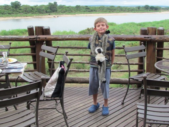 The kids have been looking at things on offer in the park shops and Simon finally decided to get himself a monkey. Here he is at Lower Sabie with his new friend.
