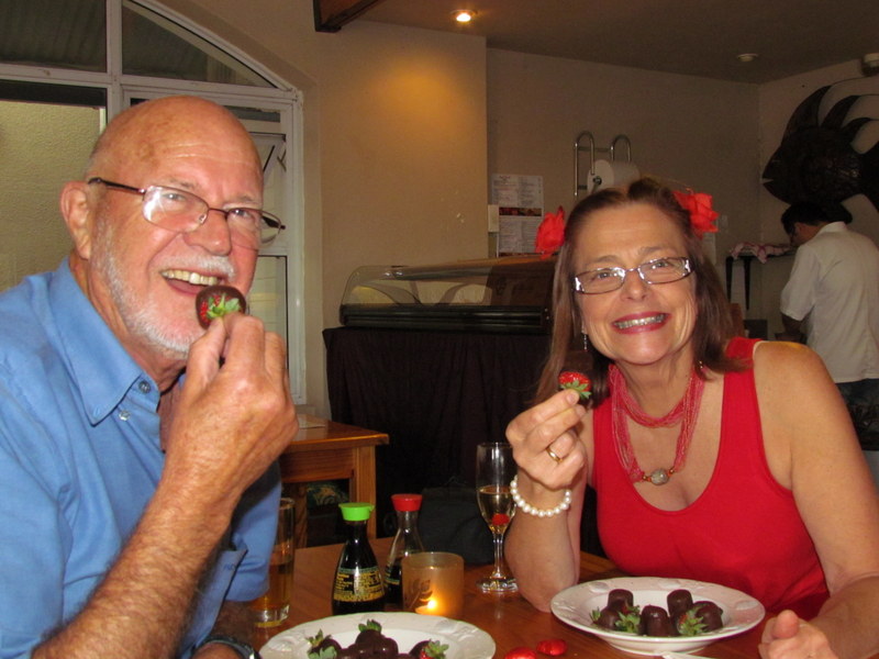 Altogether it was a very successful Valentine’s Day but it was not yet over. When I got home there were a dozen red roses from my Romantic Husband and to end a wonderful day he took me to my favourite Restaurant, Just Sushi, where we were treated to a free glass of Bubbly and a starter platter of Salmon Roses. And Dessert was rather special too.