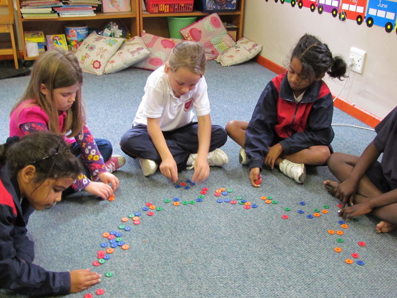 We have been working hard on our number concepts. We can count to 100, in ones, twos, fives and tens. We have worked hard on knowing the difference between before and after, one more and one less, recognising numerals and number names and many more things. Now we are ready for real sums. To introduce the concept of partners in our bonds we play a wonderful game called dancing digits which gets the children moving – so good for the brain. Each child is marked with a number (Don’t worry moms – it comes off easily!) and told to find someone else that she can partner with to make, in this case, five. They scurry around and argue and debate, little fingers work overtime and finally they connect with the right partner holding tightly to her hand until the teacher congratulates them on their cleverness.