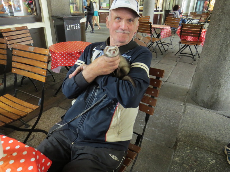 I have never seen a ferret before but today I recognised one sitting on the lap of a man at Covent Garden!  He let me pet it and told me that he has twelve at home. ‘I give them turns to come out with me,’ he said.   He also has a pet monkey – but leaves him at home!