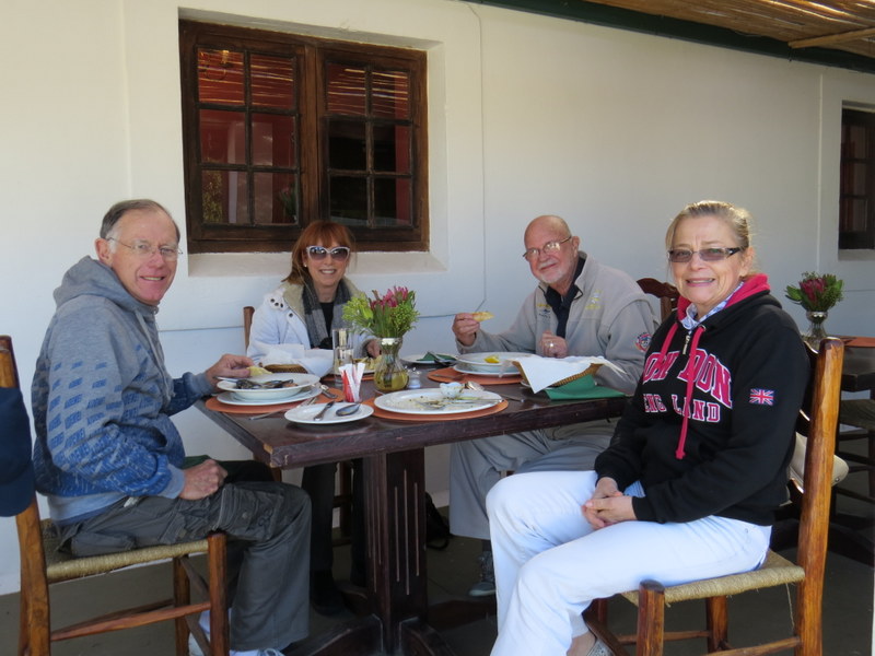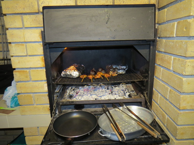 After a great day out we returned to our cosy cottage and Chef Earl produced a wonderful braai – chicken wings on sticks, skilpaaidjies (not real tortoises honestly – just liver wrapped in sheep fat) lamb chops, vegetables in foil and  Sharon’s Coleslaw.   To finish a stunning lemon meringue from Checkers’ Bakery.