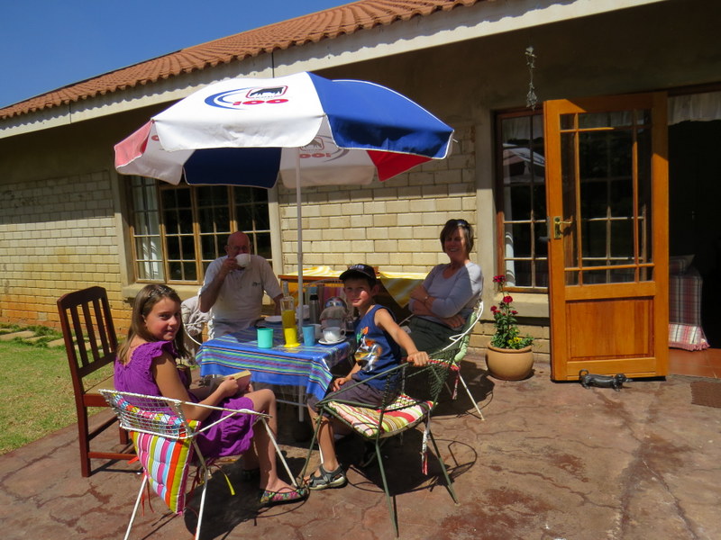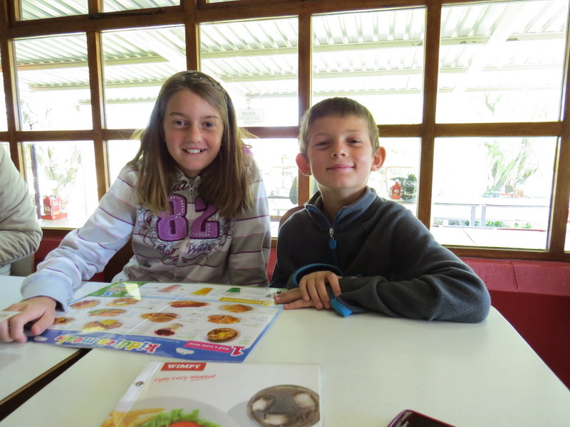On Sunday morning it was such a pleasure to be woken by Simon and Shannon shortly followed by Mom and Dad with steaming cups of coffee.  The weather was crisp and clear and freezing cold!   After a leisurely chat and lovely lie in we finally raised ourselves from bed.   There was a power failure so we decided to treat the family to a Wimpy breakfast just outside the town of Kokstad.   It had a lovely garden with play equipment for the kids.