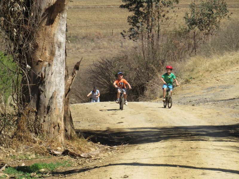 The MacKenzie boys cycling up the steep hill on their tiny mountain bikes