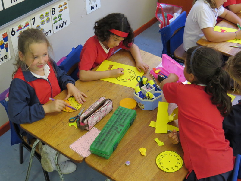 These clocks are now being used for time activities at school and are going home with the children daily. Parents, help your child to practise counting the minutes in fives, setting the hands to different times – mainly o’clock at this stage – and asking questions like, “how long will it take the big hand to get from 2 to 6” etc. Remember – always make it fun – this is just an introduction to a difficult concept.