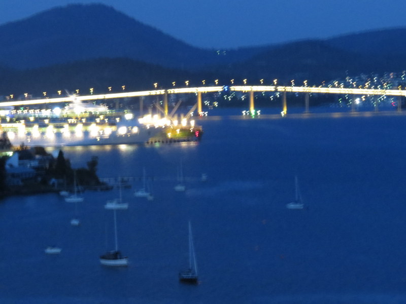 Well we finally arrived in beautiful Hobart, waited ages for the luggage to be offloaded, got our hire car – a red Golf – and with a difficulty found our accommodation – very posh with a fabulous view but all in one room! It was late so we ordered room service. Fettuccini with creamy mushroom and bacon sauce. And they only brought after I’d repeated the order four times! Anyway – it was an adventure – and things could have been worse.