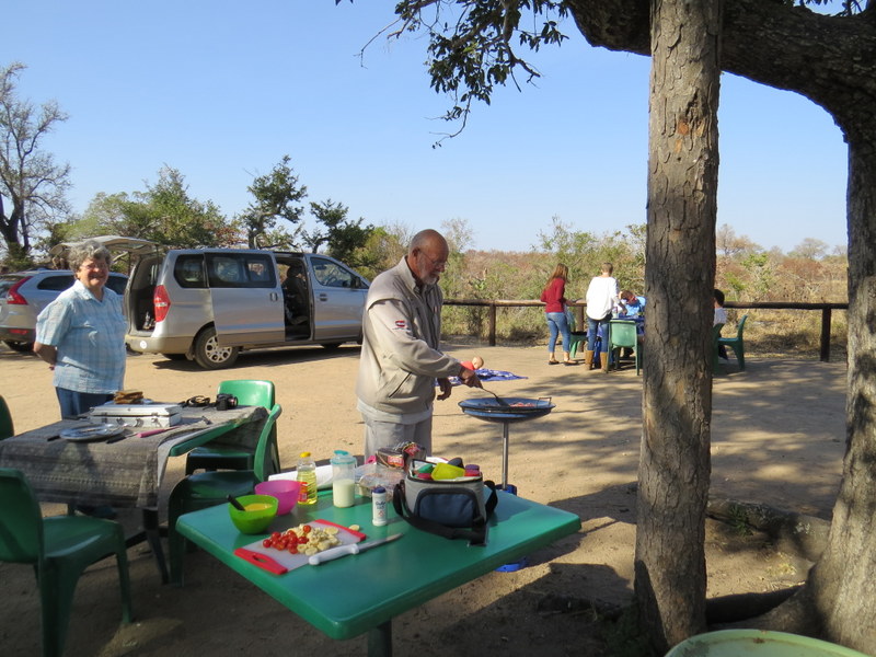 We stopped at Muzandzenzi Picnic spot where We hired a slotted for R20 and Earl cooked us a divine breakfast. We had fun watching the cheeky hornbills and starlings beg for tidbits.