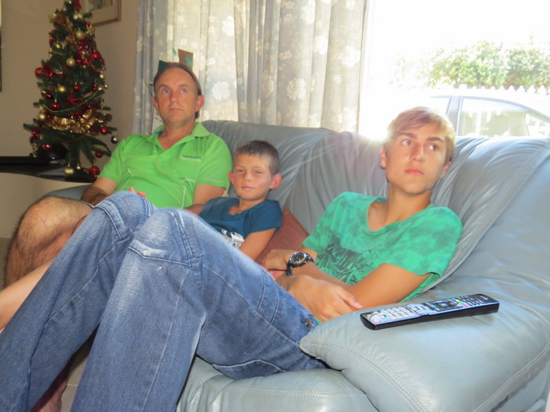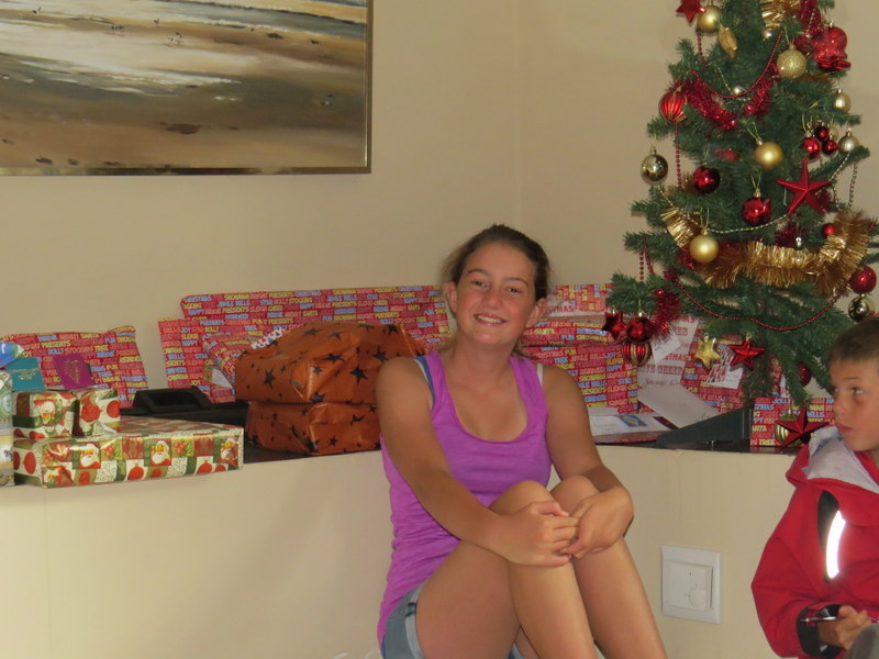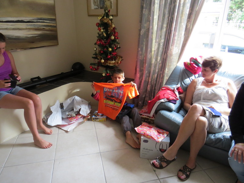 Christmas Morning – the landline shrills at the extremely rude hour of 6:15.  It can only be one person. She has been up for hours and already eaten Christmas lunch – The Darling Aussie Aunt of course. Oh she says, I thought the kids would have had you up by now! Not when half of them are in their teens!   And Shan is almost there and showing the same symptoms of needing lots of morning sleep! Simon was of course first up and did his best to rouse his cousins. Two of the daughters are real princesses and can’t be seen without their hair done and make up on so that was another delaying feature – but finally we had the entire family in the lounge after a quick fruit and yogurt pre breakfast snack ready to open presents!