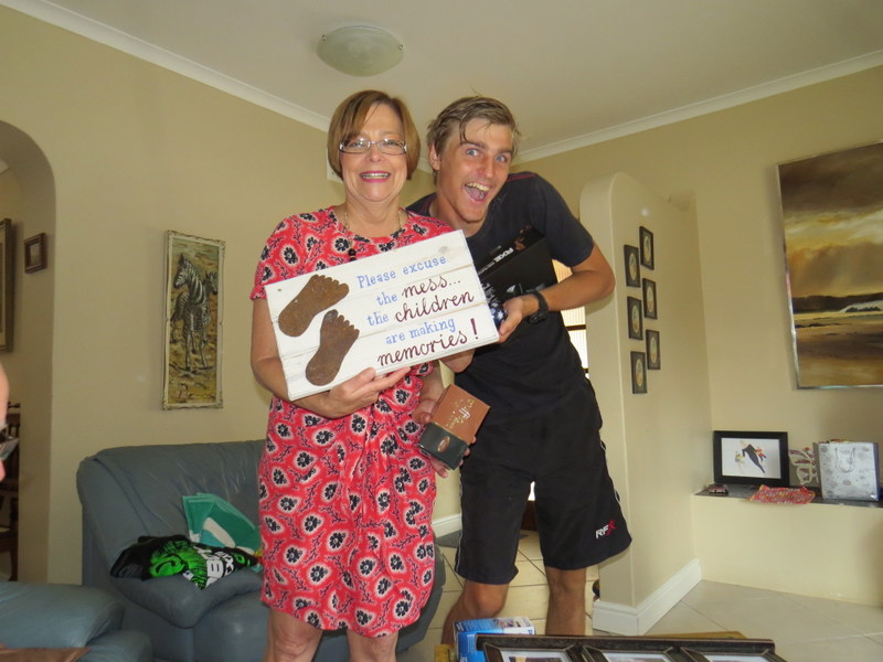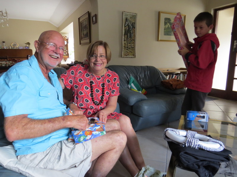 Malls during the silly season are not my favourite place.  Usually we go away as soon as the schools break up and by then I have everything organised and straight from school I either hop onto a plane or get into the car and we’re off.  But this year I lulled myself into a sense of false security and imagined I had plenty of time between Struisbaai and Christmas!  So I found myself fighting crowds in local malls and those over the mountain to get just the right thing for the right person!  And of course there was the last minute rush for a tree, Christmas Crackers – almost all sold out – and of course food.  Luckily Earl and Lauren had the latter in hand.Our precious grandson tucks in with Granny and Grandpa