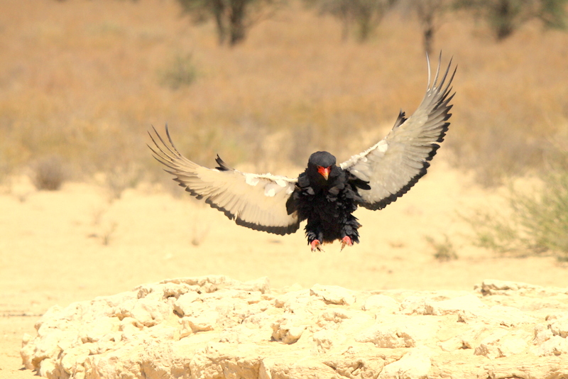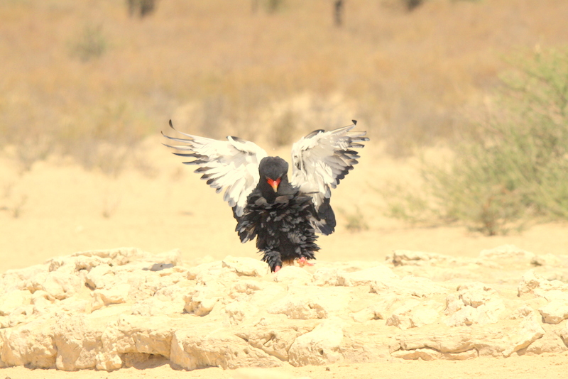 Jim turns back to see if we’re all okay but the job is done by then and we carry on. The next exciting sighting is two Bateleurs at the Cubitje Quap Water Hole. The male flies off and we see another with him in the sky – probably their juvenile. When he comes back the female spreads her wings showing all the white beneath and then she flies off and he takes a drink at the waterhole.