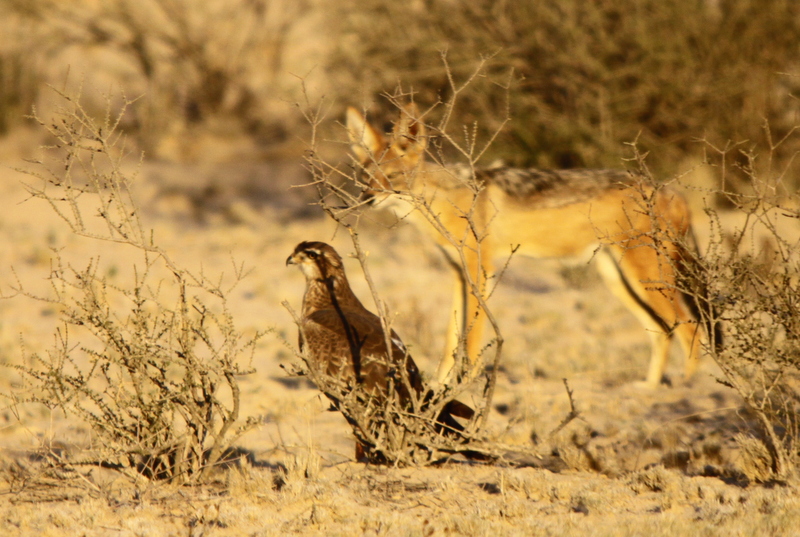 Jim and Maureen are ahead so when they slow up we know there is something interesting. Earl says – it’s a skunk thing – not able to get the right word out of his mouth. It’s a honey badger and he is in the company of a Pale Chanting Goshawk and jackal. The HB and PCG have a symbiotic relationship and are often seen together although this is the first time for us. The HB digs in the ground for insects and grubs and those that he disturbs are grabbed by the PCG. It is fascinating to watch and the highlight of our day.