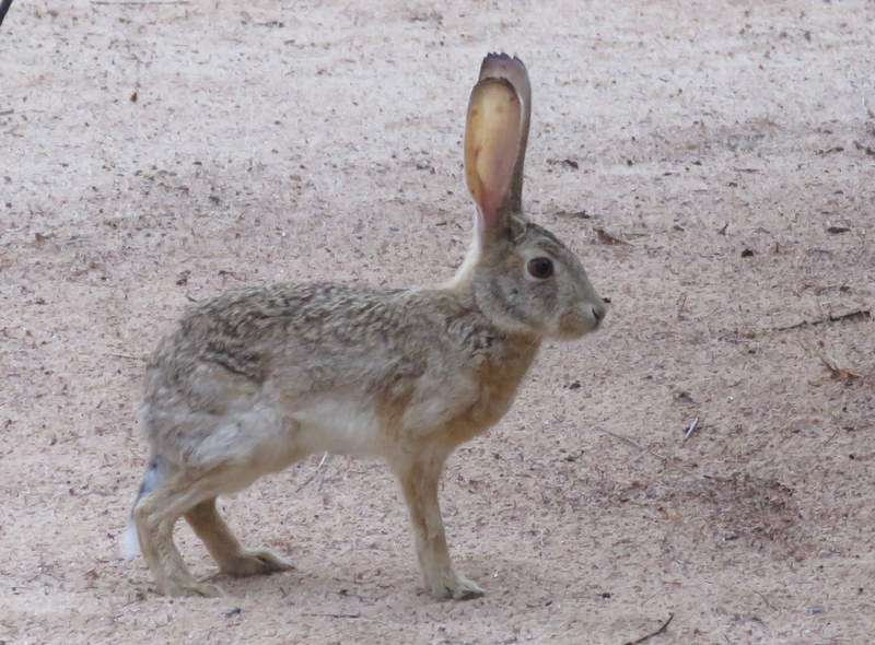 We see lion tracks and follow them till they disappear over the ridge. At Kousant we find gemsbok drinking at a much bigger waterhole than yesterday! There are game about but the animals won’t need to come to the drinking holes now that there is water aplenty lying around. We spot bat-eared foxes and suspect they have a den near Polentswa waterhole. They do not come close enough for good photographs. As we are racing back to Polentswa waterhole I call to Earl to stop – there is an African Jacana on the side of the road. He reverses but it flies off. I play the call on my phone and we see him fly up, over the car and away. No photograph! What is a jacana doing in the desert!