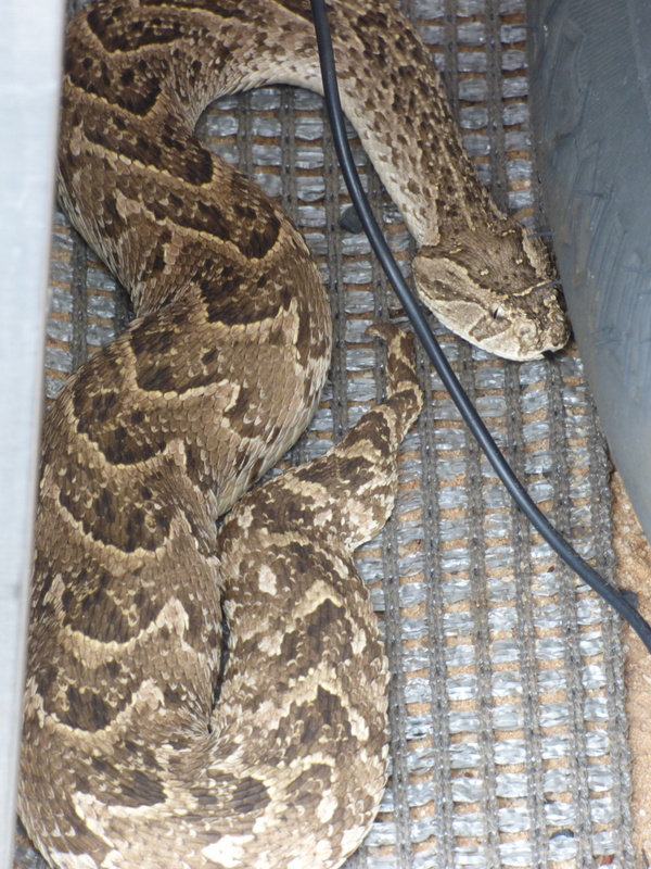 I grab my camera, Earl runs with a tent pole yelling Don’t worry I’ll catch it. Jim also bravely approaches the spot while M and I scream don’t let it bite you. We don’t have snake bite kits. The macho men approach and Earl hooks him onto the pole and flings him away and onto the ground. The snake refuses to scurry off so he lifts him again and throws him under a tree where it curls up and goes back to sleep. My hero!