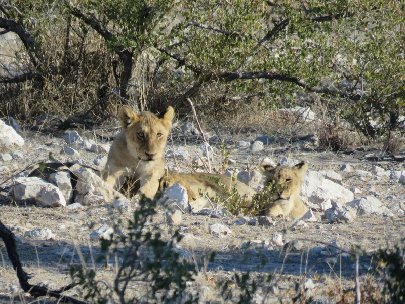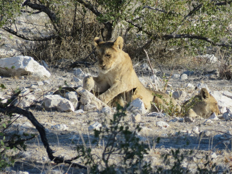 Soon we catch sight of 4 lions.  1 mother, 2 small cubs and an older sibling we think.   The Mom and big sister flop down under a tree but the cubs go on a bit further and then flop down in full view.  Oh Joy!   The older one gets up after a while and joins the little ones. We spend 20 minutes watching them get up and wander and return to the comfort of their spot. we reluctantly bid them farewell and continue happily on our way to our next destination.