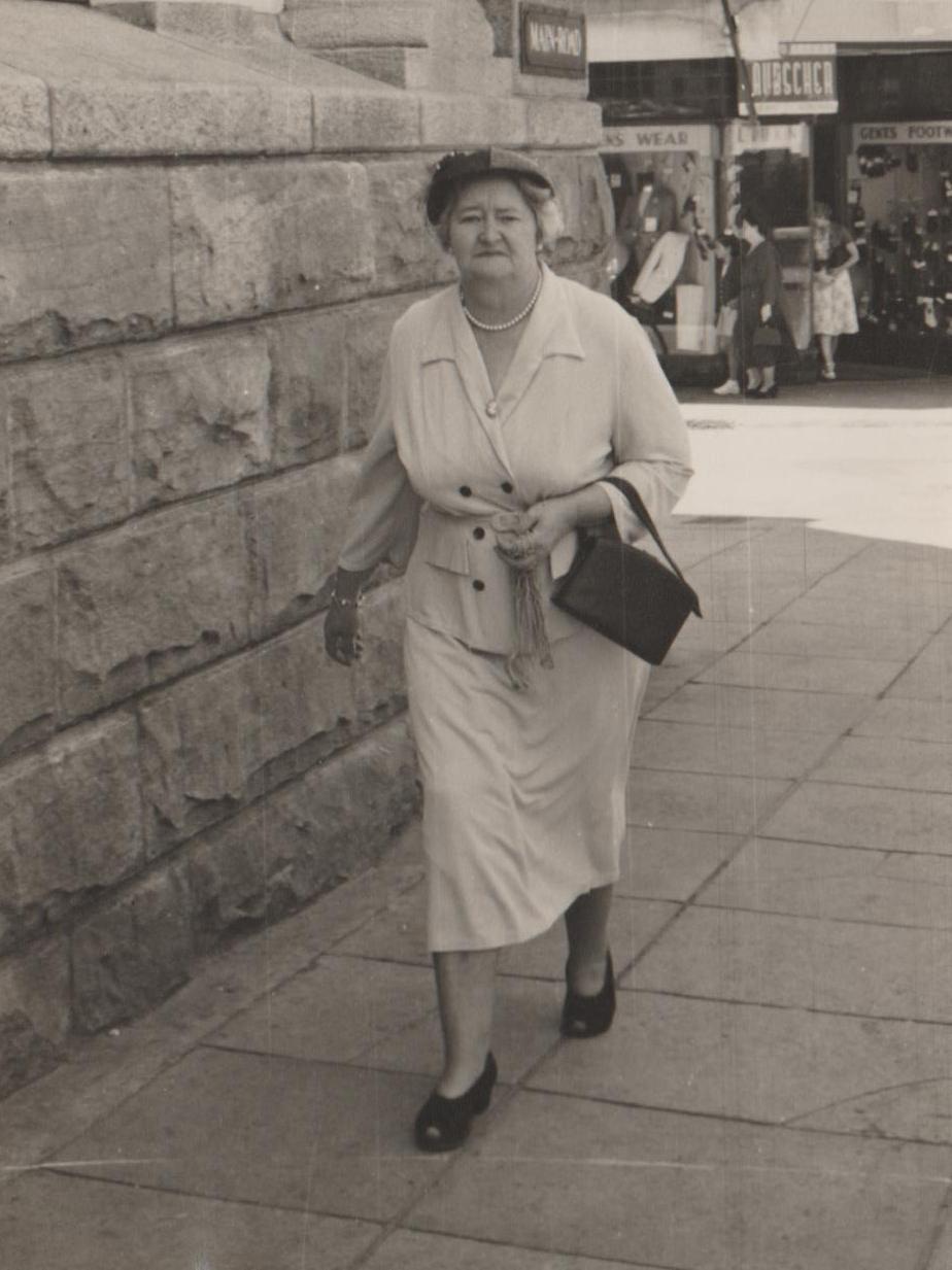 Gran always dressed smartly for a visit into the city and never left home without a hat.  Looks like a great shoe shop in the background.
