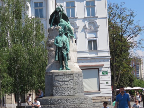In front of the church stands the statue of the poet France Preseren. It faces the window where his adored Julija Primic used to live. There is a sculpture of a muse above him sitting on a rock and holding a laurel branch in her hand. The poet is dressed in the outfit of the period and holds a book symbolising his poems.