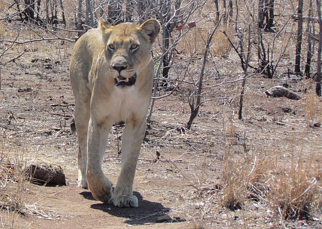 At 9 o’clock we stopped for a welcome breakfast at Letaba rest camp and found the food quite satisfactory. Earlybird had the bushveld breakfast, Eec the croissant tower, H2 the chicken burger and I had toasted egg and bacon. We tried to find the Scops owls in the campsite trees without success but did find a Kurrichane thrush sitting on her nest.