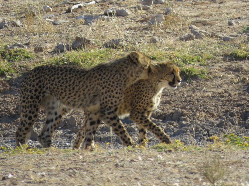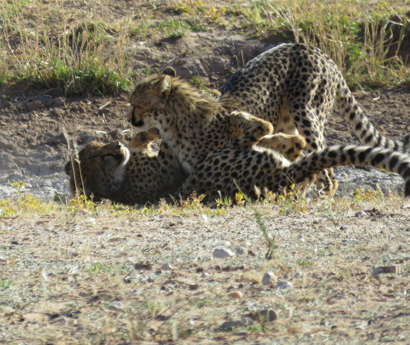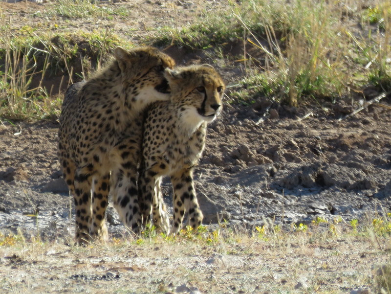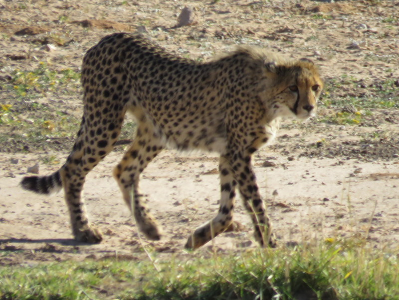 We were tired and in a hurry to get to camp when we noticed a few cars stationery up ahead. In the distance Earl pointed out a shape moving toward us. Lion, he said but it turned into a cheetah! We pulled into a space and had brilliant views of two cheetahs walking gingerly toward us. One ran across the road between the cars and the other was skittish and frightened not wanting to take the chance. He was right next to our car, on the correct side of the road for the sun not to spoil the picture. But the animal is the same color as the grass and very well camouflaged! He eventually summoned up the courage to join his mate and it was so sweet to see them greet each other and frolic together before running off into the sunset.
