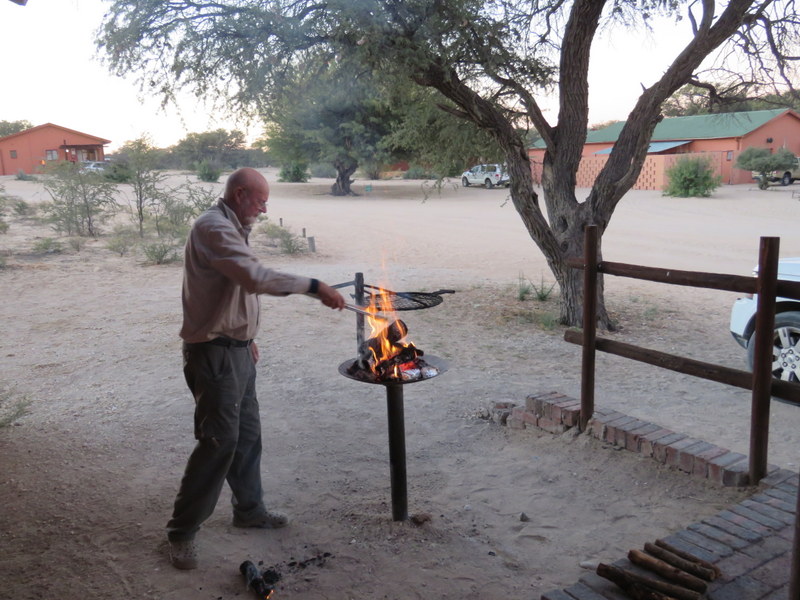 Earl remained in bed and Peter braaied our supper.   We debated whether we should abandon the trip and try and get to Upington and a doctor. I had a well-stocked first aid kit with flu medication but no antibiotics.  Earl’s fever was over 40 degrees C, which worried me. Once at Gharagab we would be settled for three nights – no driving around as the only road is the one-way, round trip on a  4X4 track between Nossob and the wilderness camp. Travelling to Twee Rivieren would take forever and then it would be another 250 km to Upington.  I thought Earl would be more comfortable staying put and decided that he might as well be sick there as anywhere else.  So the plan was for me to drive the 4×4 track and see how things went.