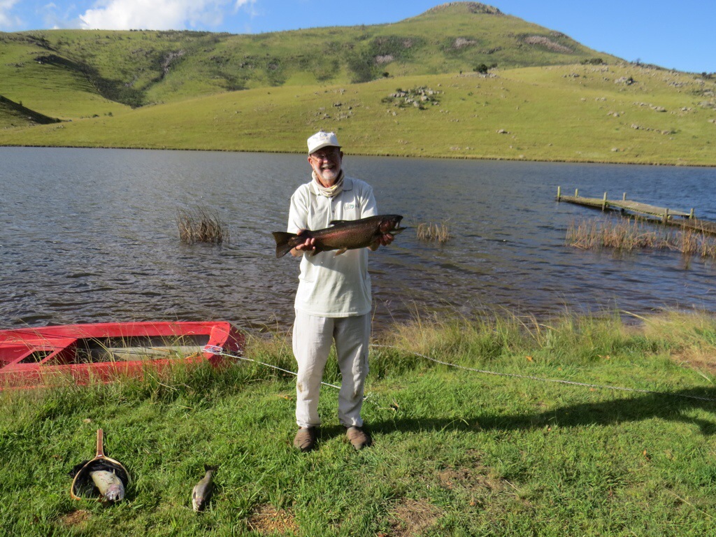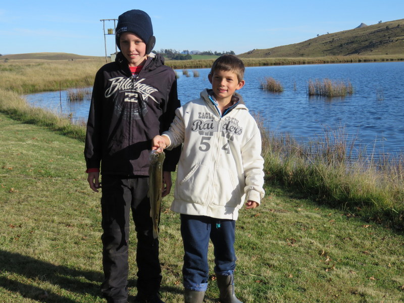 Earl came back around 1 o’clock by which time the mist had cleared and it was not too chilly outdoors. He’d caught 4 small trout which he froze. We had a quick snack and cup of tea then went for a drive to the bottom dam and did some bird watching on the way. We saw crowned crane and white stork just over the fence from the cottage. Other birds common to the area are yellow bishop, red bishop, Cape weaver, red-shouldered widow-bird, red-collared widow-bird, long-tailed widow-bird, stonechats, yellow-throated longclaw, greater striped swallows, barn swallows, white throated swallows, pied starlings, yellow-billed kite, jackal buzzard all of which we saw. At the bottom dam we there was a single darter, swimming at first but then he settled on the edge of the reeds before flying off.