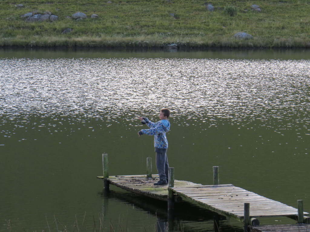 This morning we woke at 6 o’clock but it was still misty and wet so we went back to sleep. We woke again at half past eight and Earl whipped up a lovely breakfast of scrambled eggs, bacon and banana. He then found a large stone to use as an anchor and went dressed in his oilskins to seek out the trout. I’d packed Jay’s walkie-talkies and it was a relief for him to take one so we could keep in touch. Last year I was frantic because I couldn’t see him in the mist.
